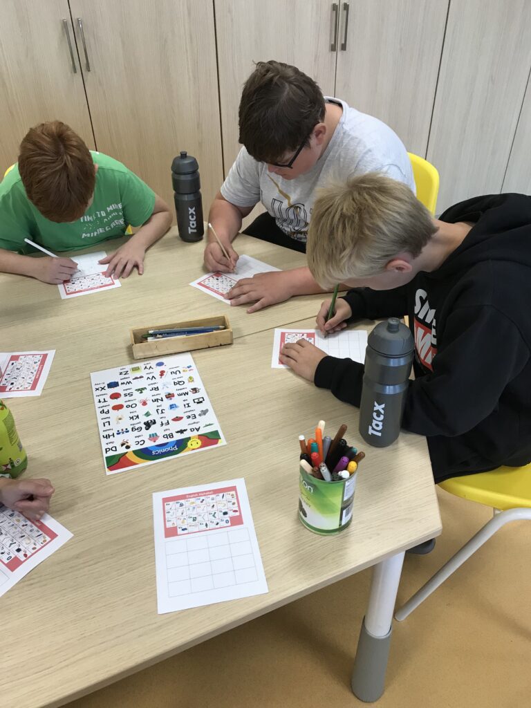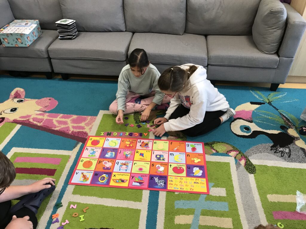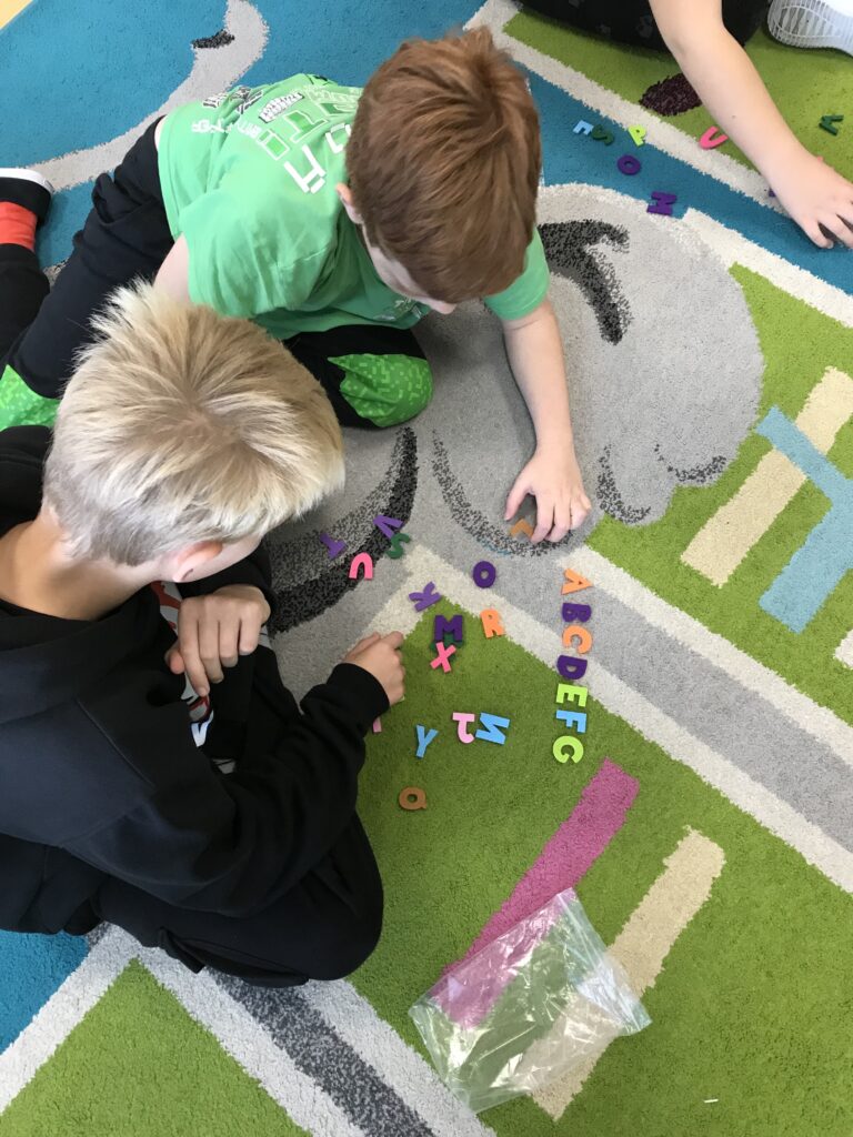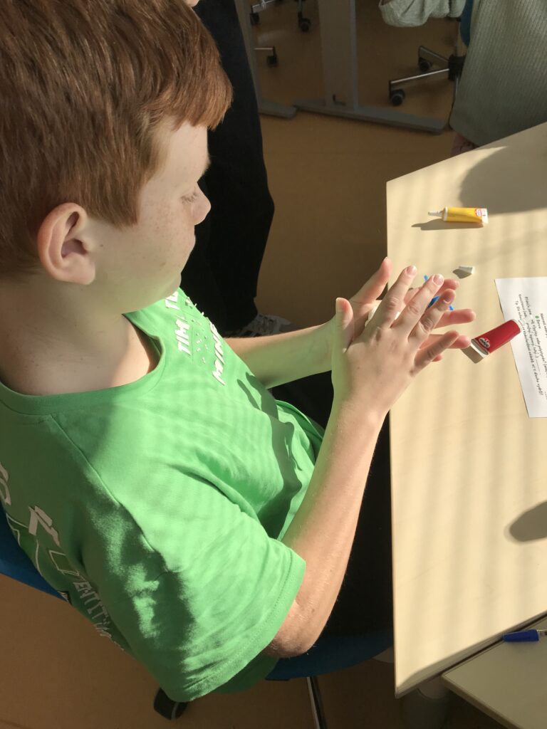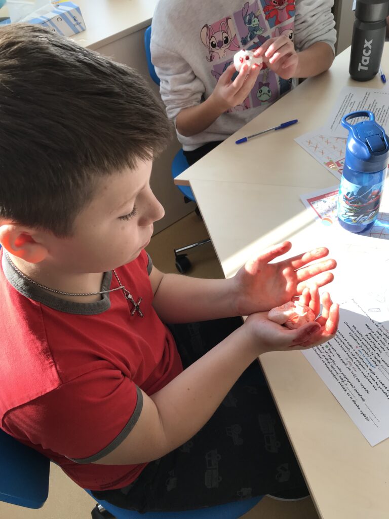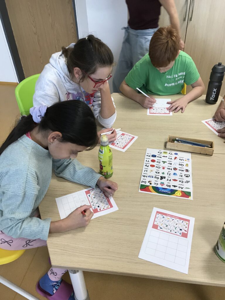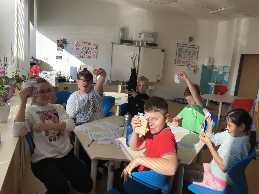 Po ukončení aktivit na prvních stanovištích se obě třídy prostřídaly. Třída 5. A šla vyrábět barevný sliz a třída 5. B se pustila do procvičování anglických slovíček a abecedy.