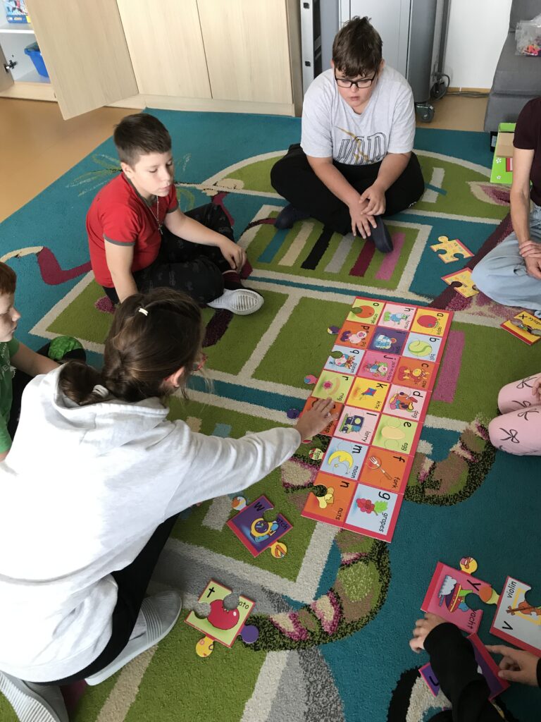 Po příchodu do střediska se žáci rozdělili podle tříd a přesunuli se na první stanoviště. Třída 5. A měla na programu zábavnou angličtinu. Formou hry a pomocí krásných didaktických pomůcek si žáci procvičili anglická slovíčka a anglickou abecedu. Nechyběla písnička ani závěrečná hra Bingo.
