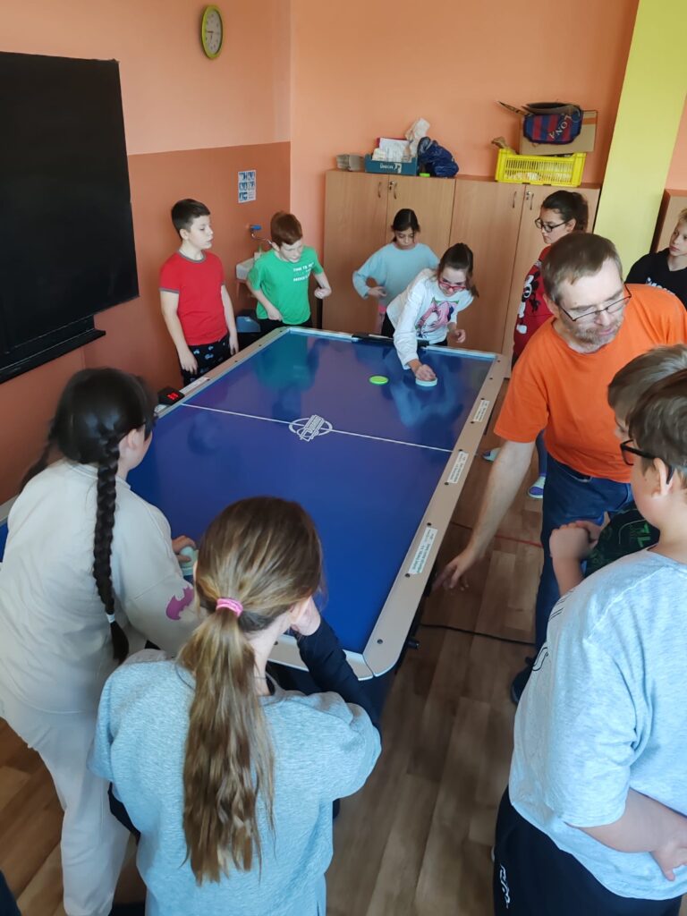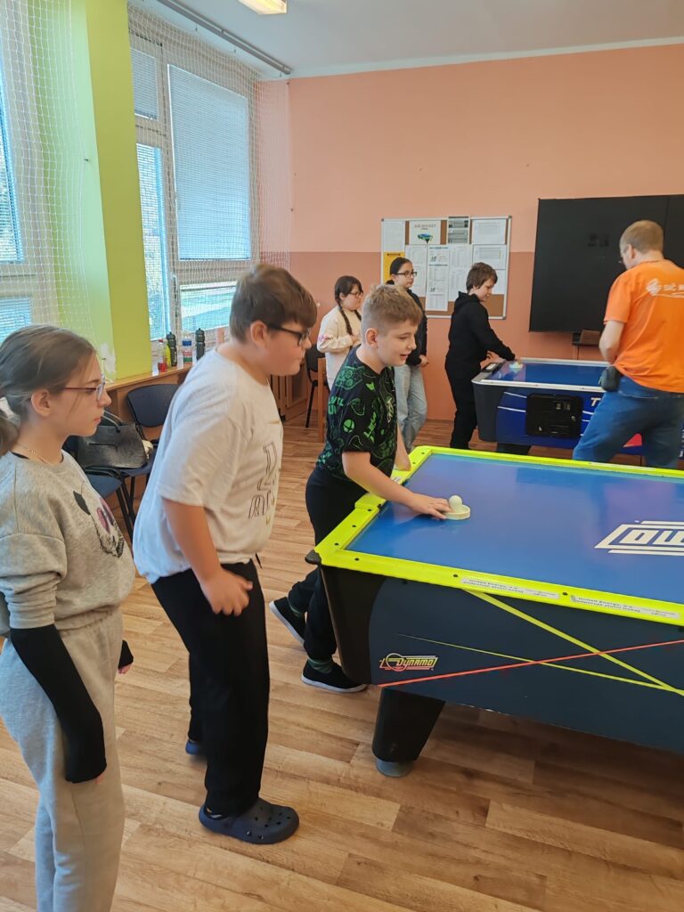 Poté se obě třídy sešly v kuchyňce SVČ a děti se nasvačily. Po svačině se šlo sportovat. Obě třídy se odebraly do místnosti, kde na ně čekal stolní air hockey. Nejdříve se soutěžilo po skupinách a poté proběhly zápasy jedinců. Tato aktivita žáky velmi nadchla. Sportovní akce byla ukončena vyhlášením vítězů a rozdáním diplomů s lízátky.