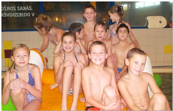 V rámci plaveckého kurzu, který by měl probíhat vždy ve 3. a 4. ročníku, pravidelně vždy kolem 20. dne v měsíci navštěvujeme Aguadrom v Mostě, kde se pod vedením třídní učitelky Mgr. Soni Müllerové učíme základy plavání. Hodina začíná vždy malou rozcvičkou v malém bazénku, pak trénujeme foukání do vody a správné dýchání. Poté trénujeme splývání formou her a pak se vrháme na samotnou techniku plavání. První jsou kraulové nohy a poté ruce. Snažíme se přidat i správné dýchání do vody. Když vše pečlivě natrénujeme v malé hloubce, přemístíme se do velkého bazénu, kde začínáme naostro. Tam se teprve ukáže, kdo bral trénink vážně a dělal správně vše, co mu p. učitelka řekla. Paní učitelka vždy zařadí i nějakou hru, jako např. „Vaření knedlíků či Hříbečky.